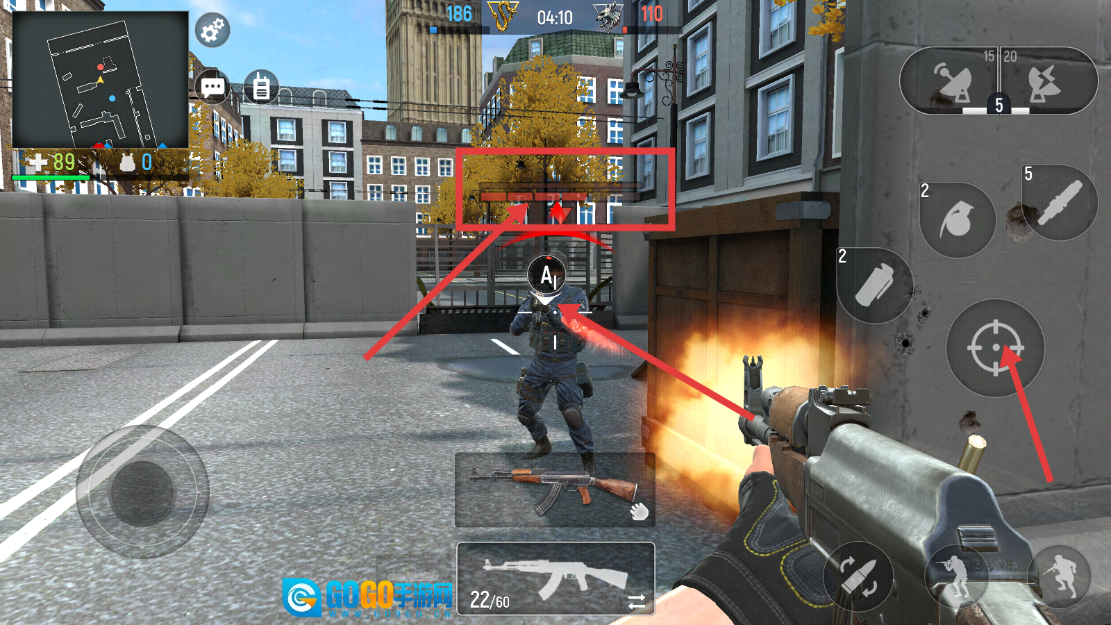 3、遭遇敌人时对准目标,点击射击键开火,借助【AK-47】进行火力压制,留意弹药【22/60】的消耗情况。