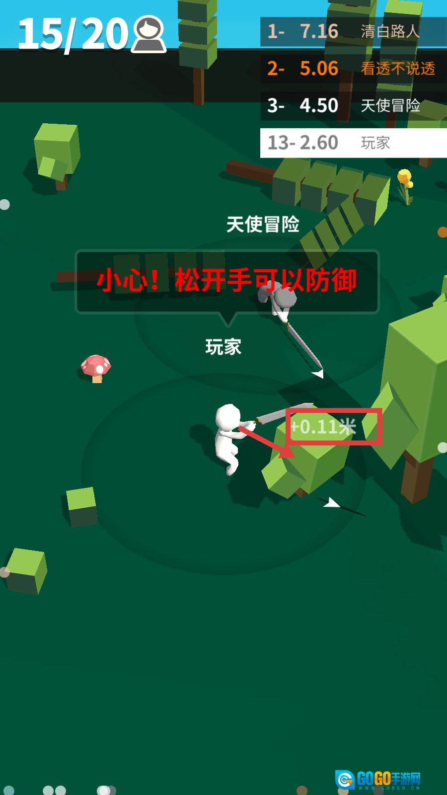 2、战斗过程中留意【小心!松开手就能防御】的提示,攻击树木这类物体能让刀的长度增加,像【+0.11米】这样的增益可以辅助战斗。