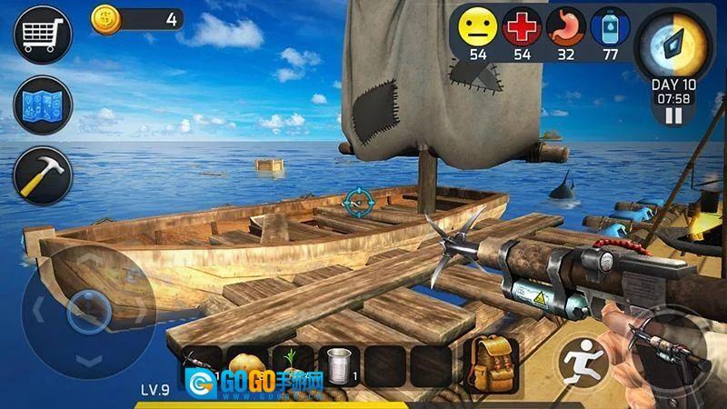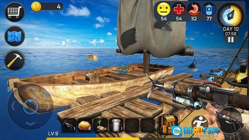 一开始资源比较匮乏,得靠钩爪来收集物资。途中偶尔会遇到一些小岛屿,这时候可以用船锚把木筏固定住,要是造了斧头就能登岛采集更多资源。等后面能力提升了,还能在船上装捕网道具,这样就能更轻松地从海面上被动获取资源了。