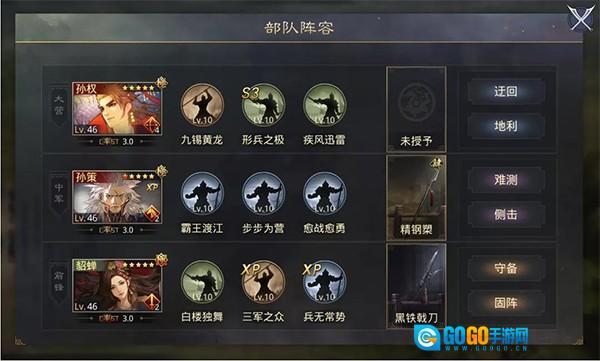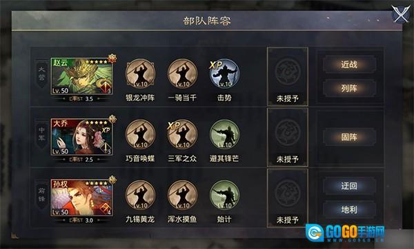 中军孙策选择全攻击加点,搭配战法【步步为营】与【愈战愈勇】,是队伍的核心输出点。若将【步步为营】替换为【桃园结义】,虽能在后几回合提供更稳定的输出补充,但队伍整体坦度会有所降低。