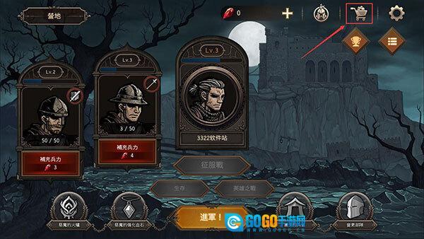 1、启动国王之血防御最新版本游戏,进入游戏主界面后,点击右上方的【购物车】图标