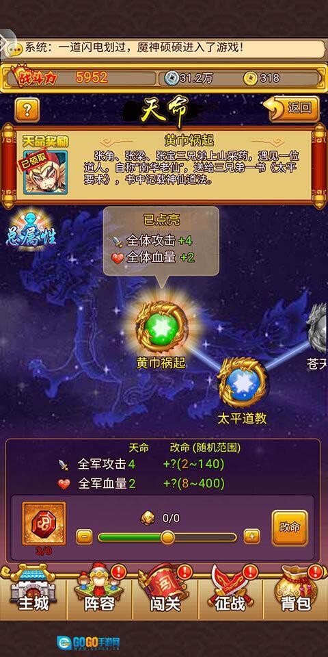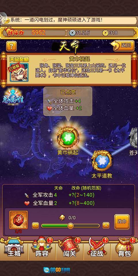 玩家能够消耗改命星来对已经点亮的天命执行改命操作,改命时会随机得到属性。每一次改命都会随机额外提升对应天命属性的数值,改命所获得的属性会在括号内进行随机选取。