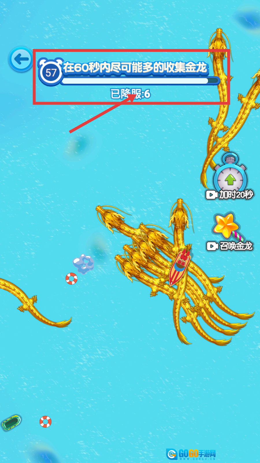 2、在【60秒内尽可能多的收集金龙】任务里,要加快行动节奏,留意【已降服-6】的数量变化,力求收集到更多金龙。