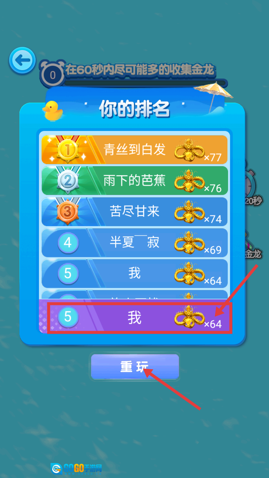 4、游戏结束后查看排名,要是拿到第5名(比如【我-x64】这种情况),可以点击【重玩】按钮重新挑战,努力提高排名和收集的数量。