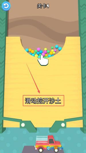 1、看到提示「滑动挖开沙土」后,按住屏幕拖出一条通道,这样角色就能顺着斜坡滑落了。
