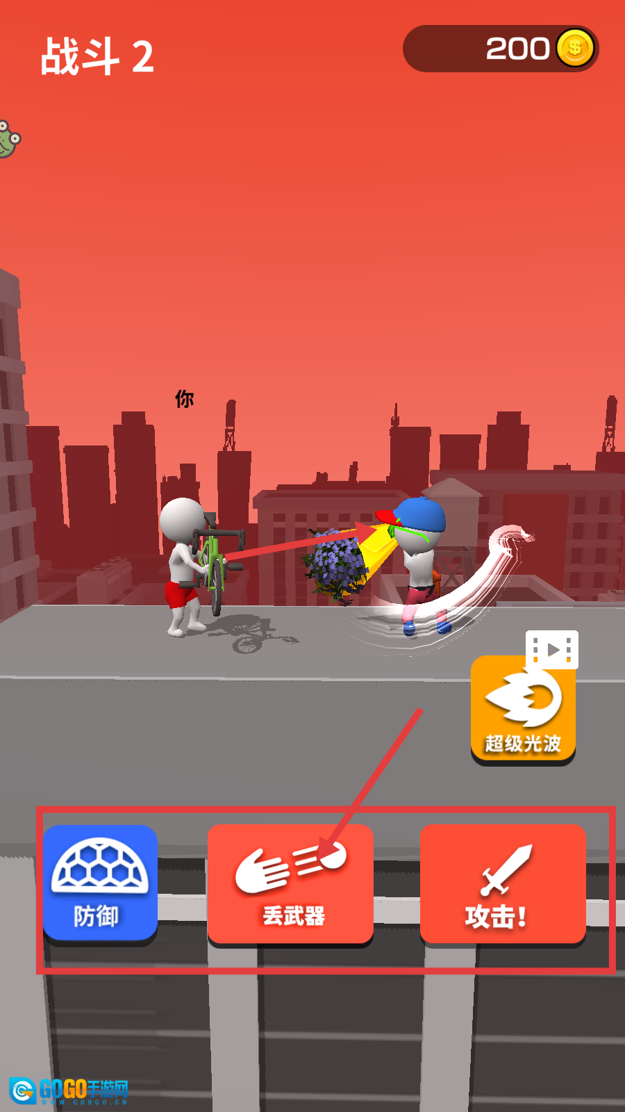 3、在【战斗2】环节里,要灵活运用【防御】【丢武器】【攻击!】这几个按钮,依据实时战局挑选恰当的操作方式,从而战胜敌方角色。