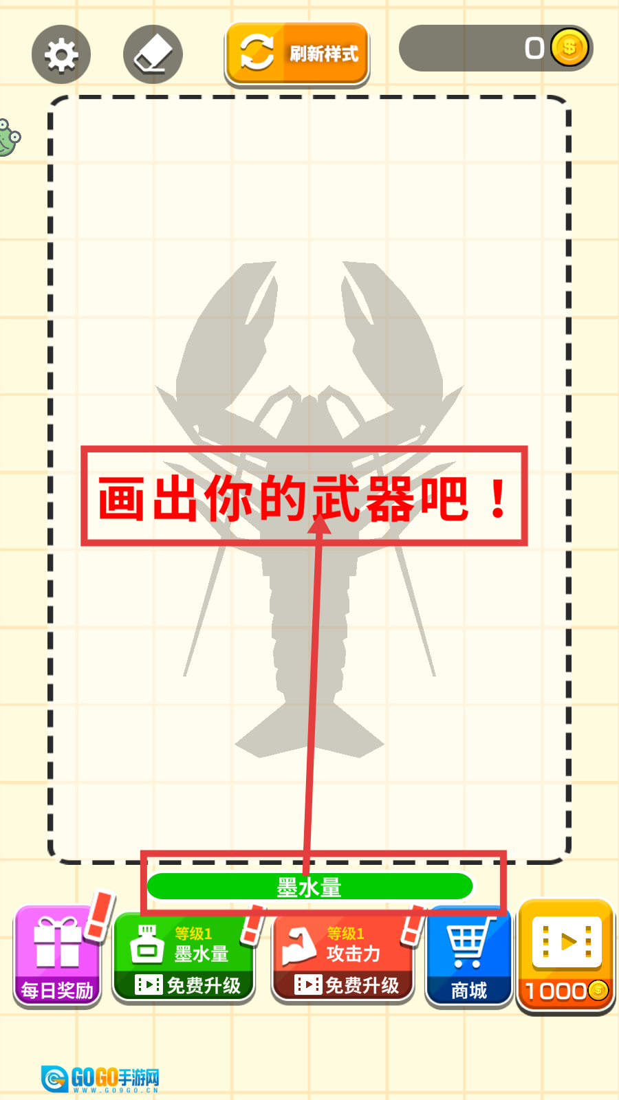 2、进入【画出你的武器吧!】界面后,可消耗【墨水量】资源来绘制专属武器,以此为后续战斗做好准备。