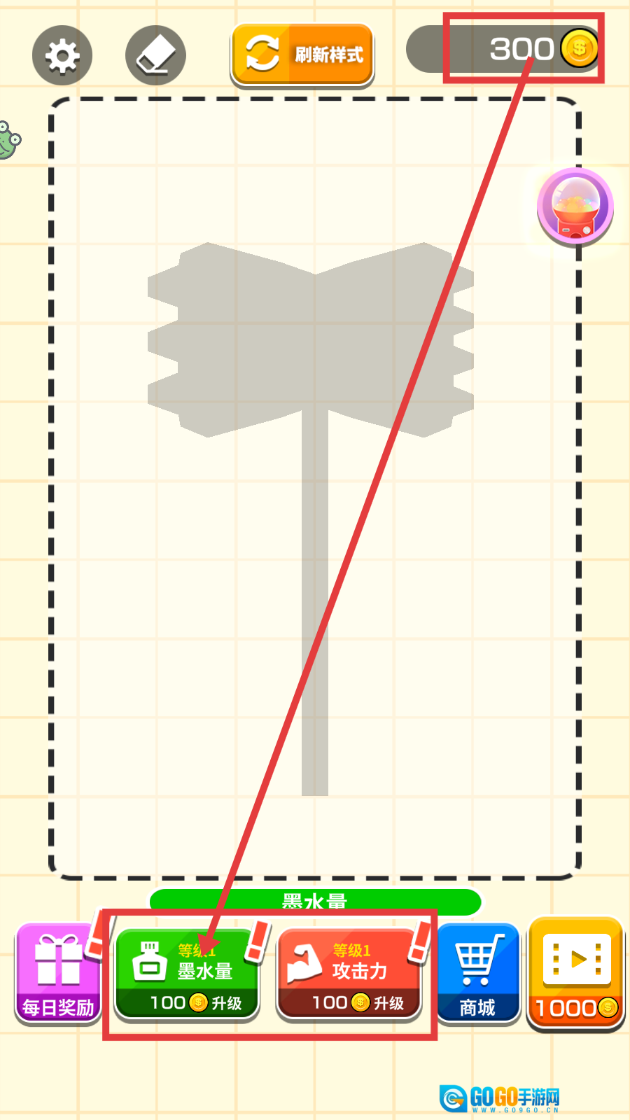 1、消耗【300金币】升级【墨水量】与【攻击力】,强化武器的绘制表现和战斗效能,为接下来的挑战积蓄力量。