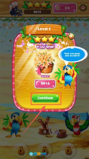 4、当进度显示为「6/6」且屏幕上出现「YOU WIN!」时,点击「Continue」按钮领取9815分,随后进入下一关。