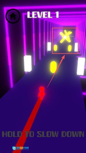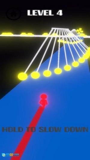 3、接着,按住屏幕的任意位置来启动“HOLD TO SLOW DOWN”机制,借此精准把控角色的下落速度,从而避开障碍物。