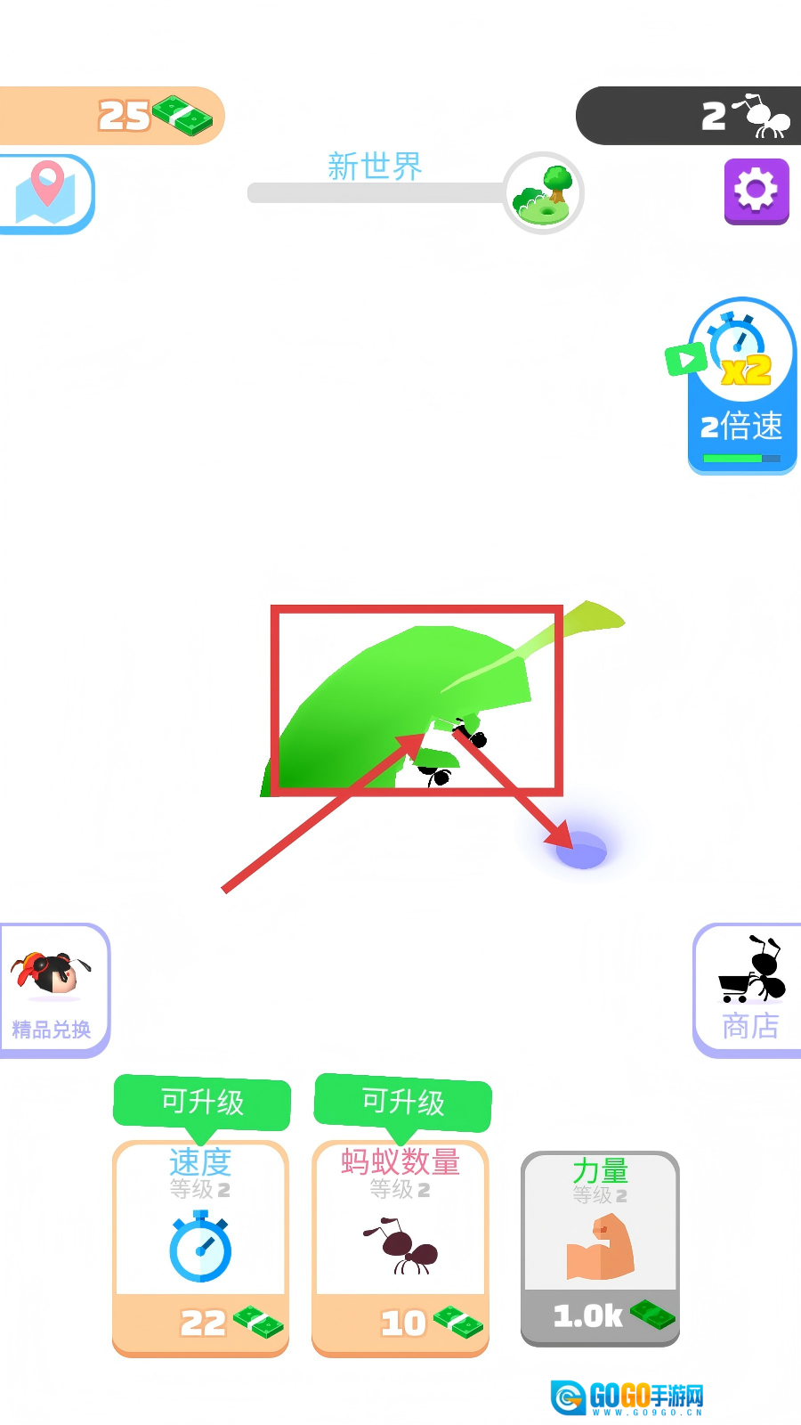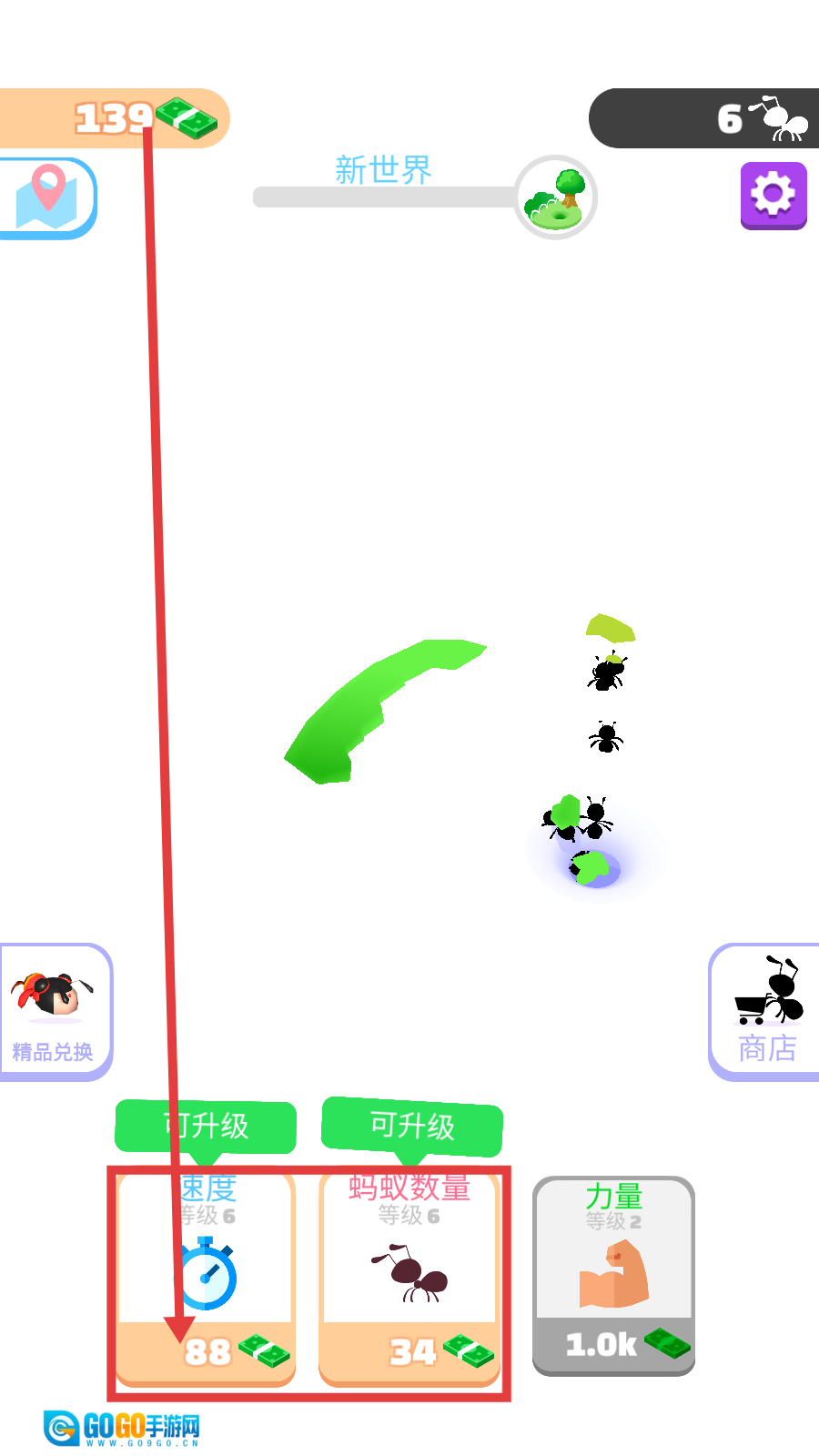 1、蚂蚁搬运资源时,可关注【速度】【蚂蚁数量】【力量】这些升级选项,借助它们提高搬运效率,此外还能通过【精品兑换】【商店】来获取增益效果。