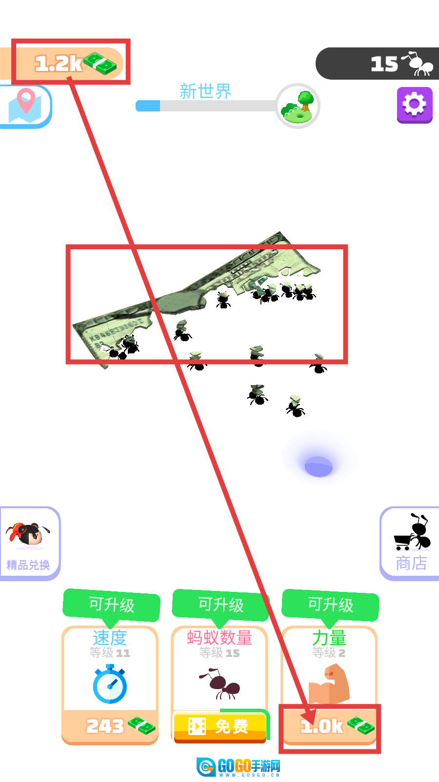 1、积累到1.2k资金后,优先升级【力量-1.0k】,让蚂蚁能高效搬运大额资源,快速积累更多资金。