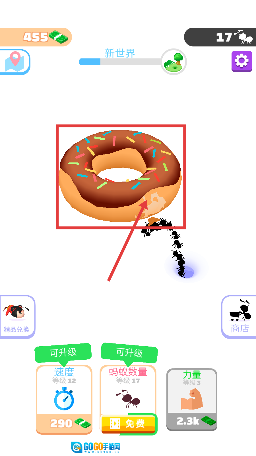 4、蚂蚁搬运甜甜圈时,升级【速度】和【蚂蚁数量】,提升新食物资源的搬运效率,快速积累资金。