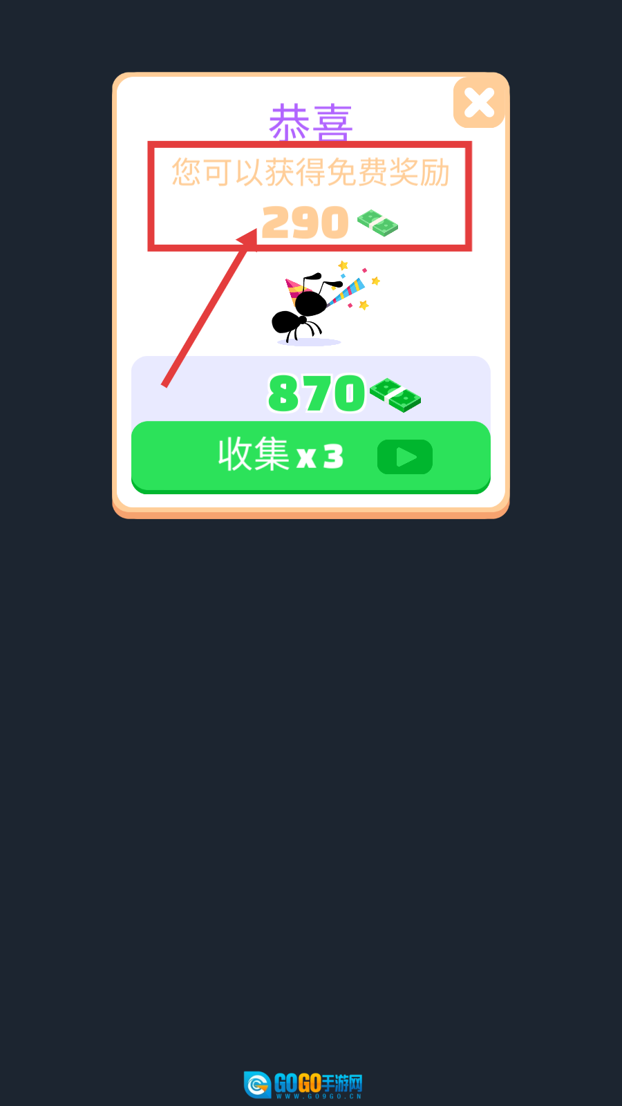 3、领取【免费奖励-290】资金,可通过点击【收集x3】观看广告,获取三倍资金用于各项升级。