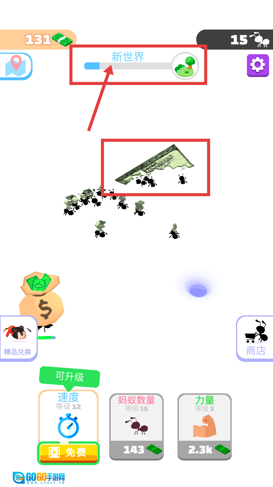 2、关注【新世界】进度条,通过蚂蚁持续搬运资源,推进进度以解锁新区域和内容。