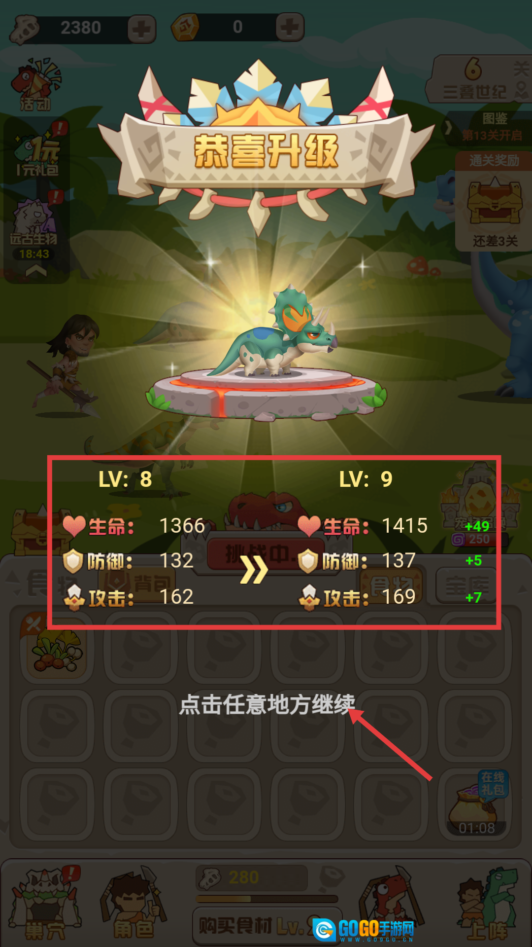 3、恐龙升级后生命、防御、攻击大幅提升,点击任意地方继续,增强战力挑战更高关卡。