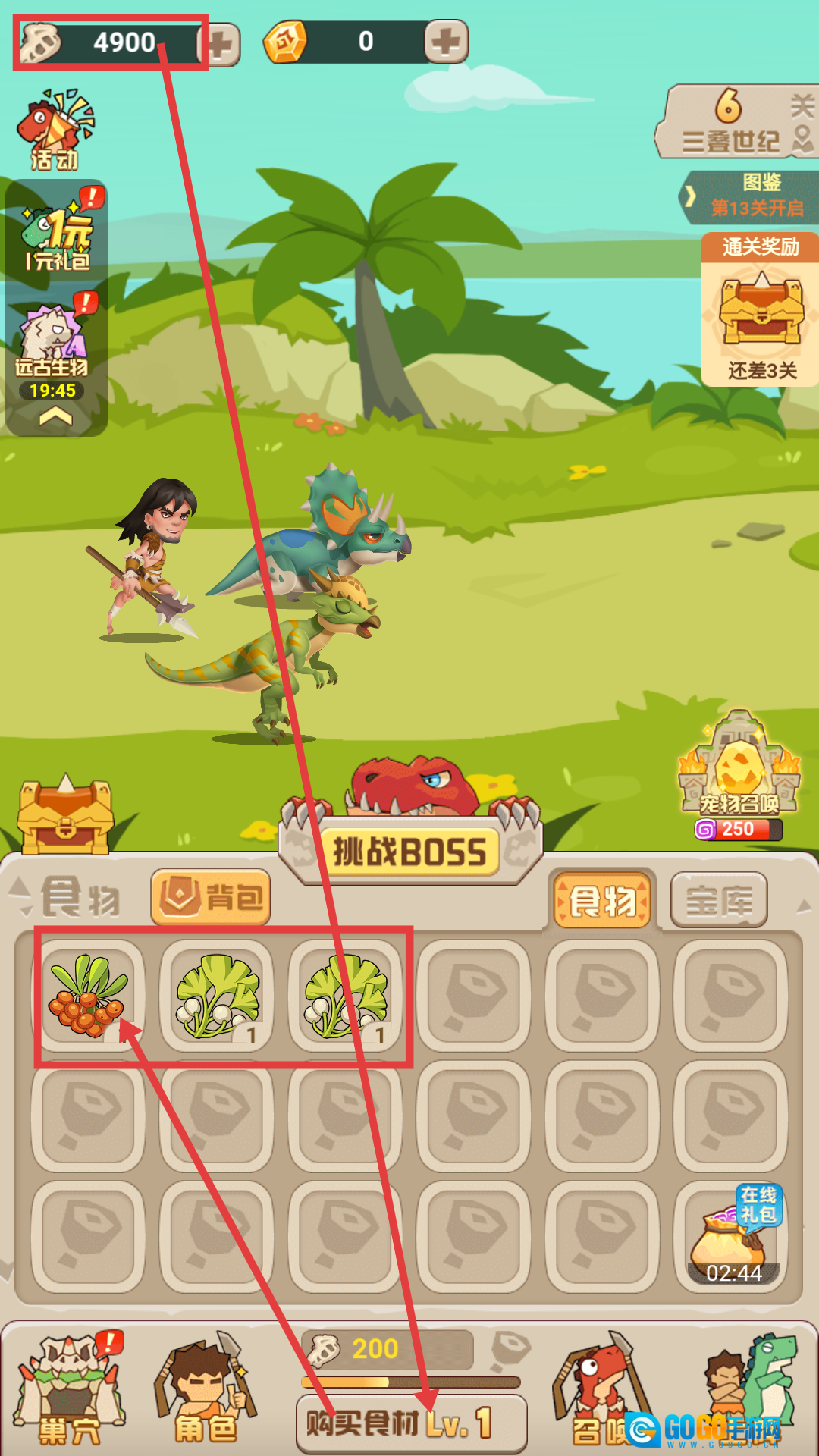 1、拥有【4900-资源】时,购买食材,提升恐龙战力,为挑战BOSS和战斗做好准备。