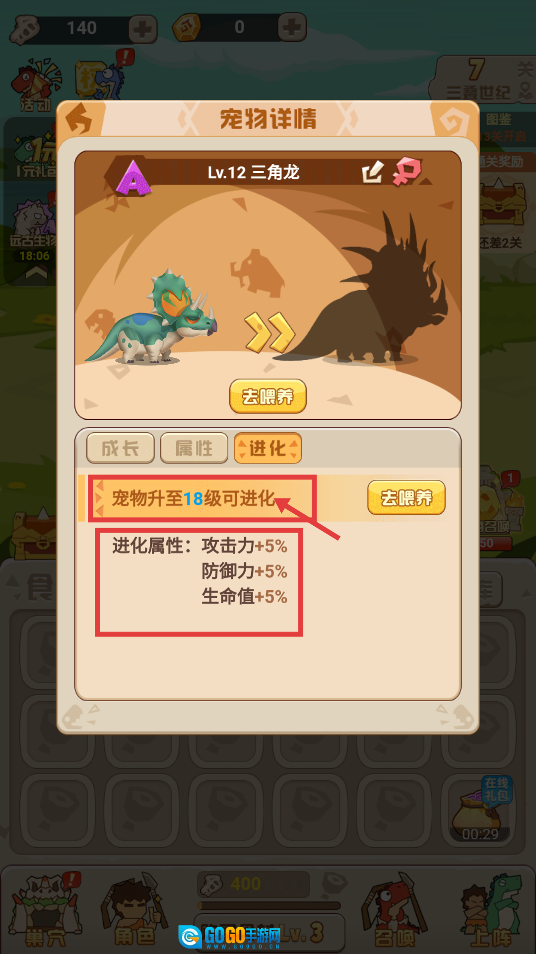4、宠物三角龙升至18级可进化,进化后攻击力、防御力、生命值各+5%,快去喂养提升等级。