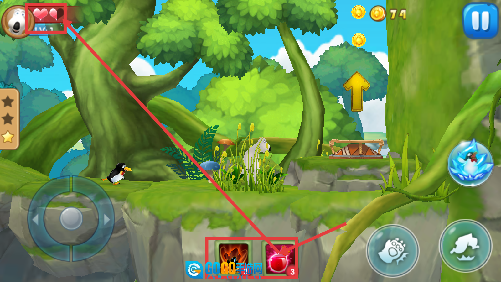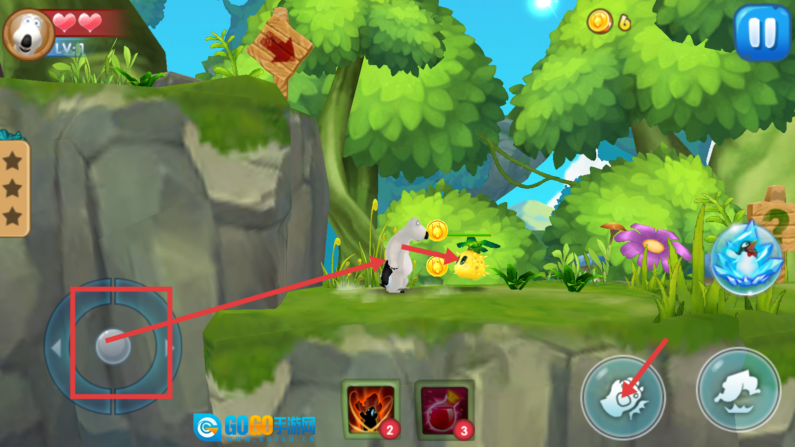 3、注意左上角【生命值】变化,当血量不足时及时使用下方技能道具,如【红色药瓶-3】等,保障角色生存能力以顺利闯关。