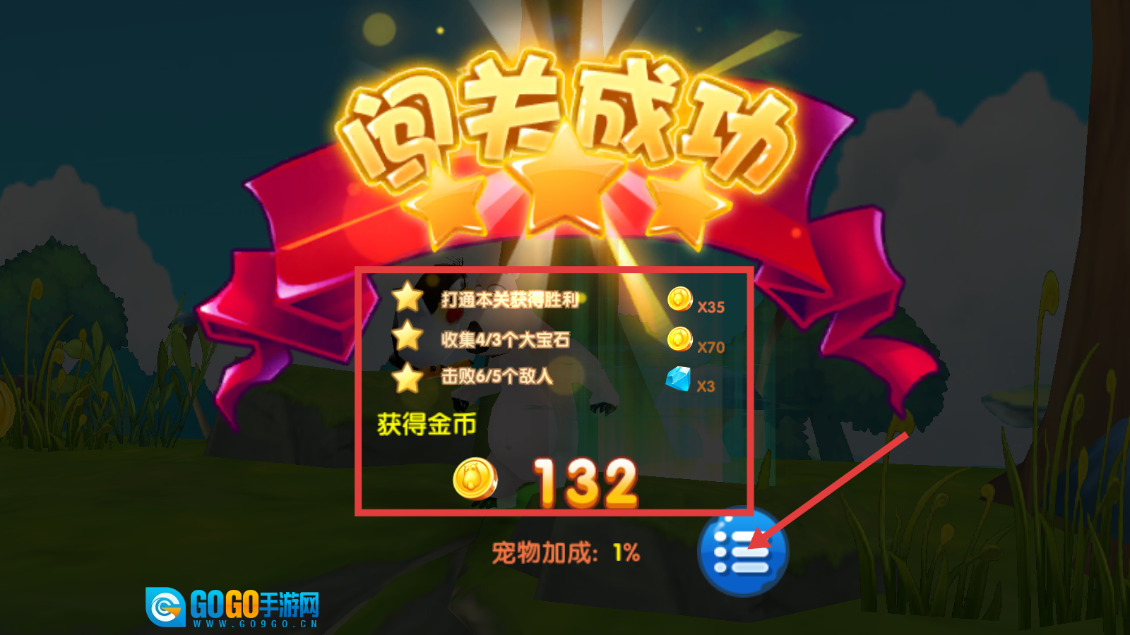 4、闯关成功后可获得【金币-x35/x70】【钻石-x3】等奖励,留意【宠物加成-1%】的收益提升,点击下方按钮查看后续关卡或奖励详情。
