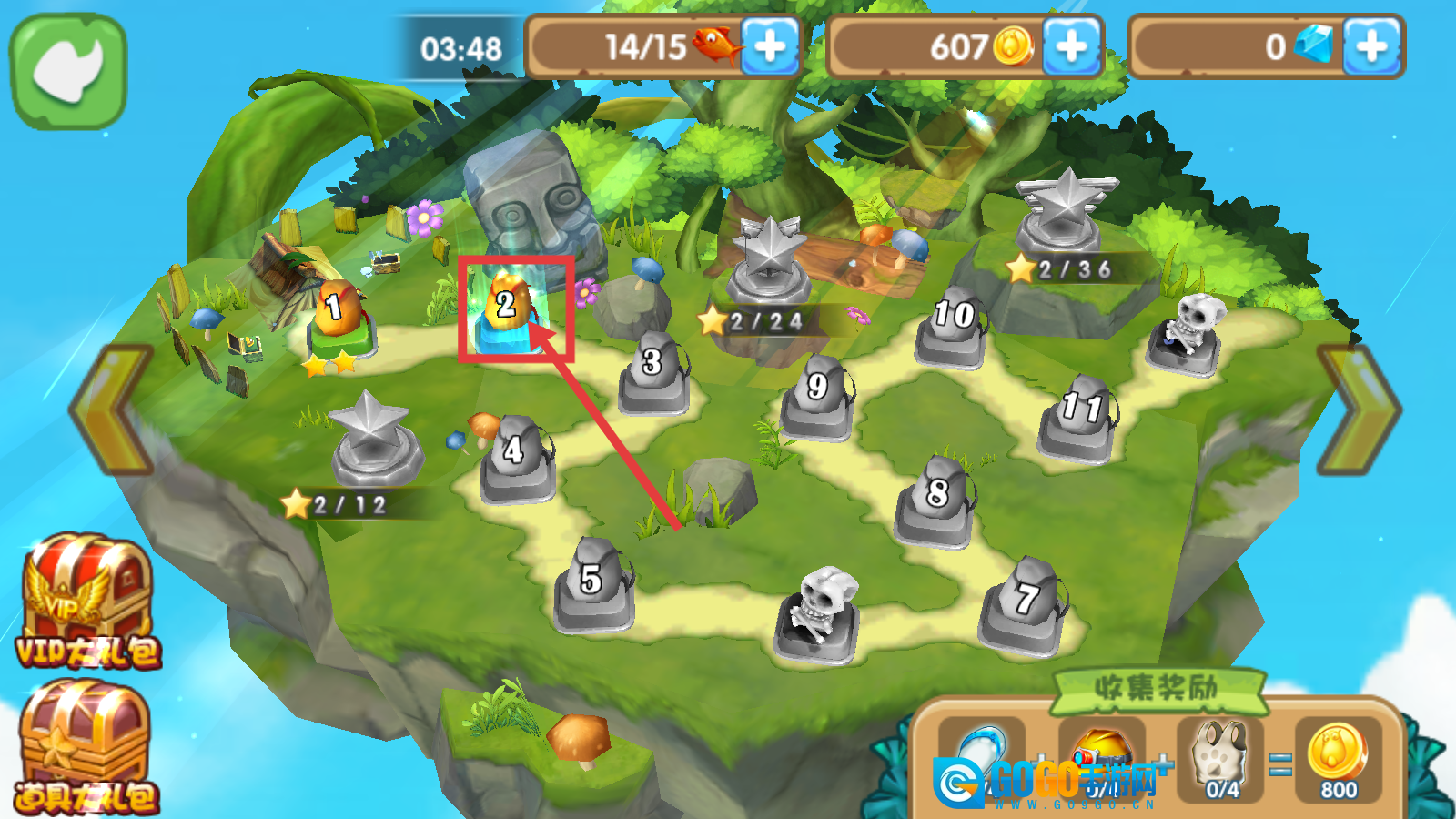 1、选择关卡时优先挑战如【2-关】的可解锁关卡,留意上方【鱼-14/15】【金币-607】等资源,规划闯关顺序以逐步解锁更多关卡。