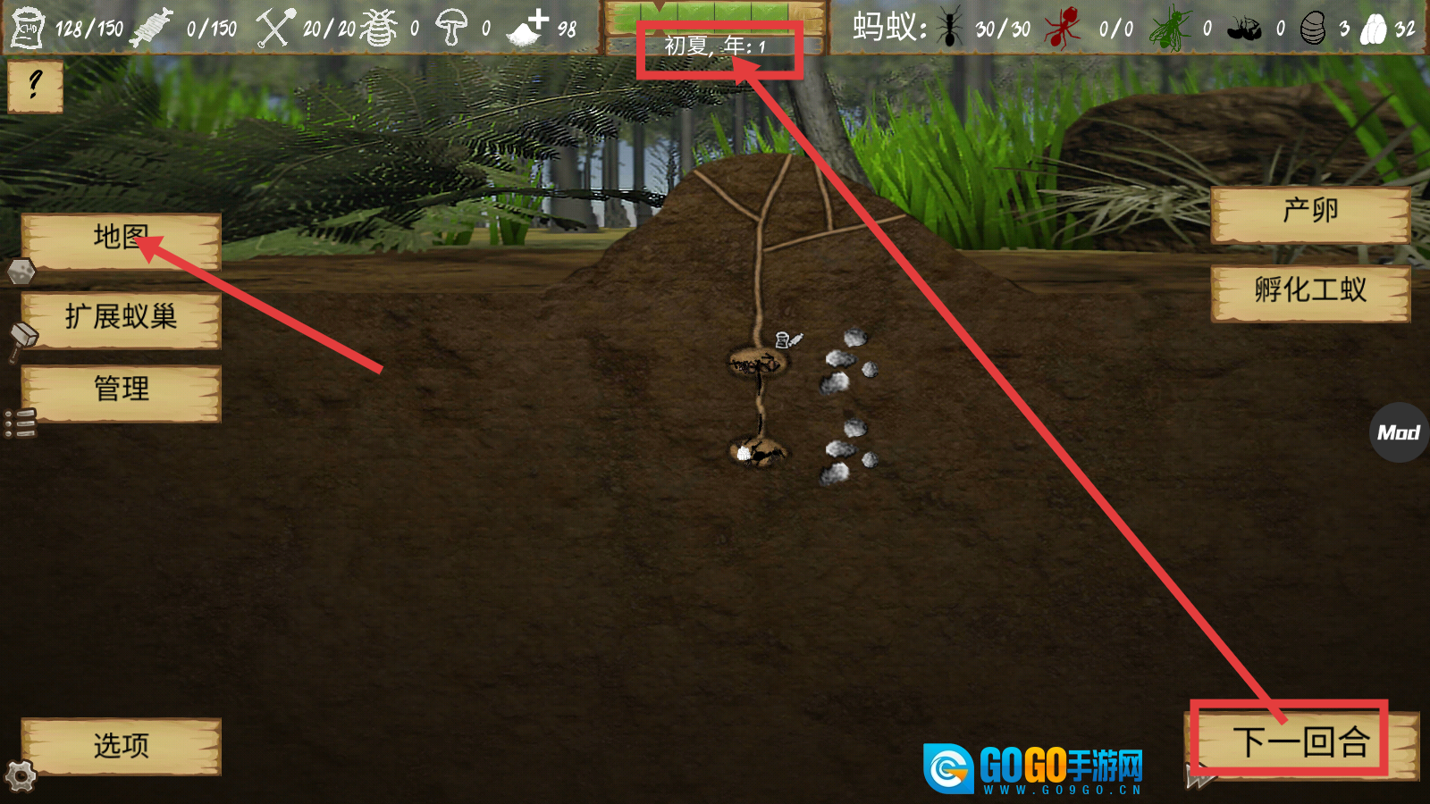2、进入游戏后,点击【地图】,关注【初夏-年:1】的时间进度,点击【下一回合】推进游戏进程,逐步发展蚁群。