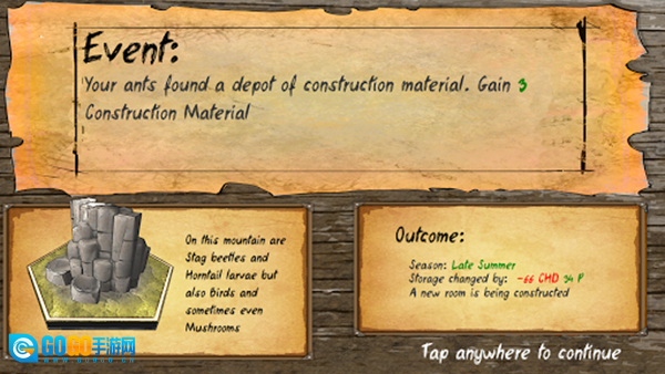 4、派遣蚂蚁探索巢穴周围地图采集食物,或通过侦查室深入未知区域寻找资源,探索过程发现新机会与威胁。