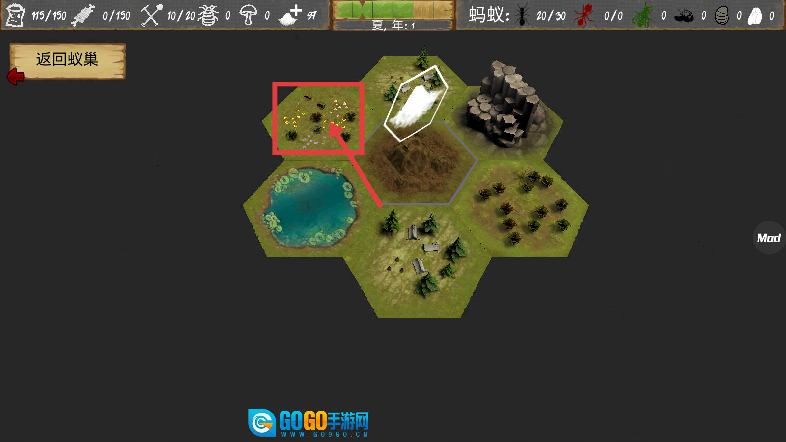3、在地图界面中,选择有花朵的区域,派遣工蚁前往探索,获取资源,为蚁巢扩张和发展积累物资。