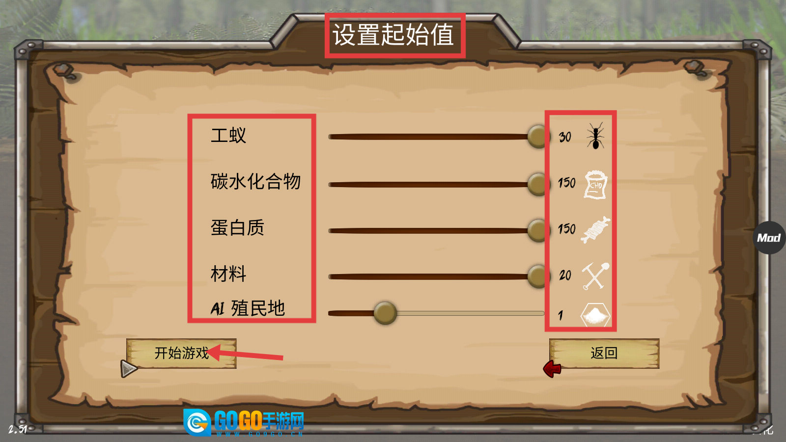 1、在【设置起始值】界面,调整【工蚁】【碳水化合物】【蛋白质】等参数后,点击【开始游戏】,完成蚁群模拟的开局配置。