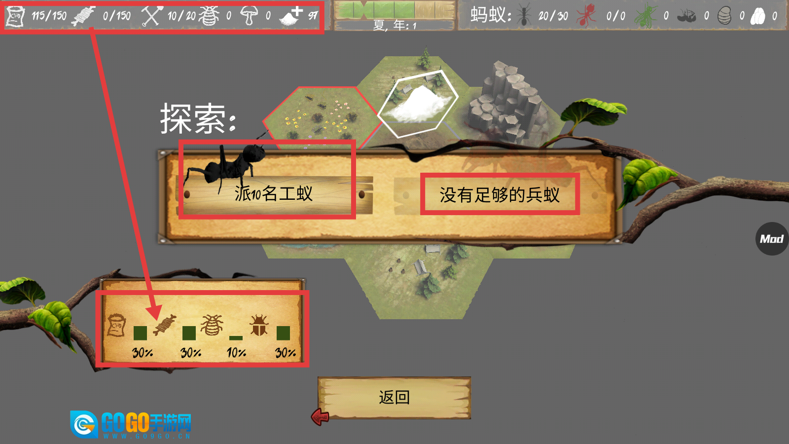 4、派【10名工蚁】执行任务,根据【30%-碳水化合物】等资源比例规划探索,同时留意【没有足够的兵蚁】的提示,及时补充兵蚁。