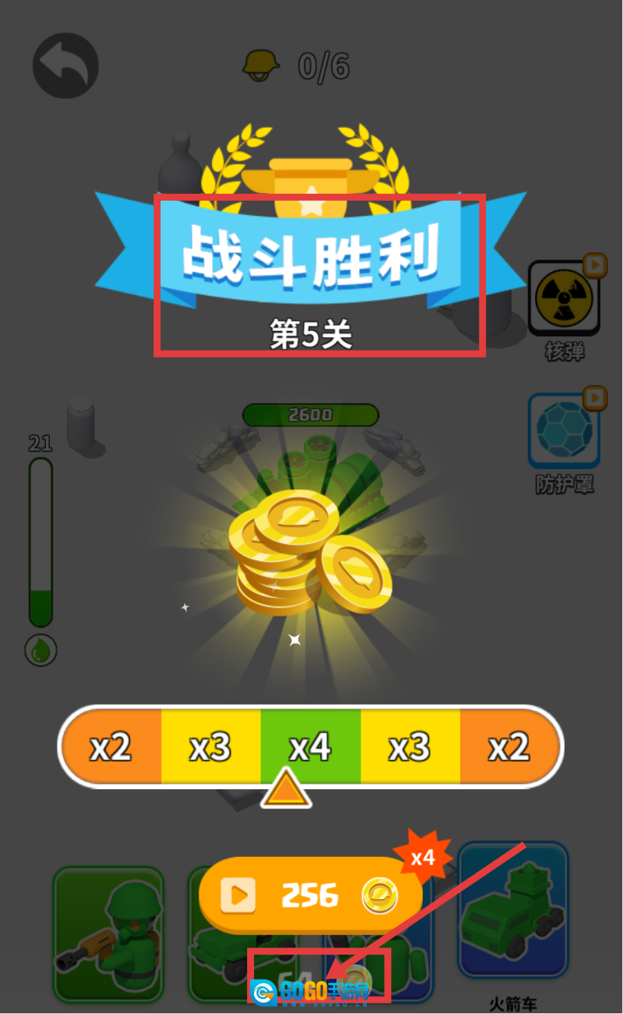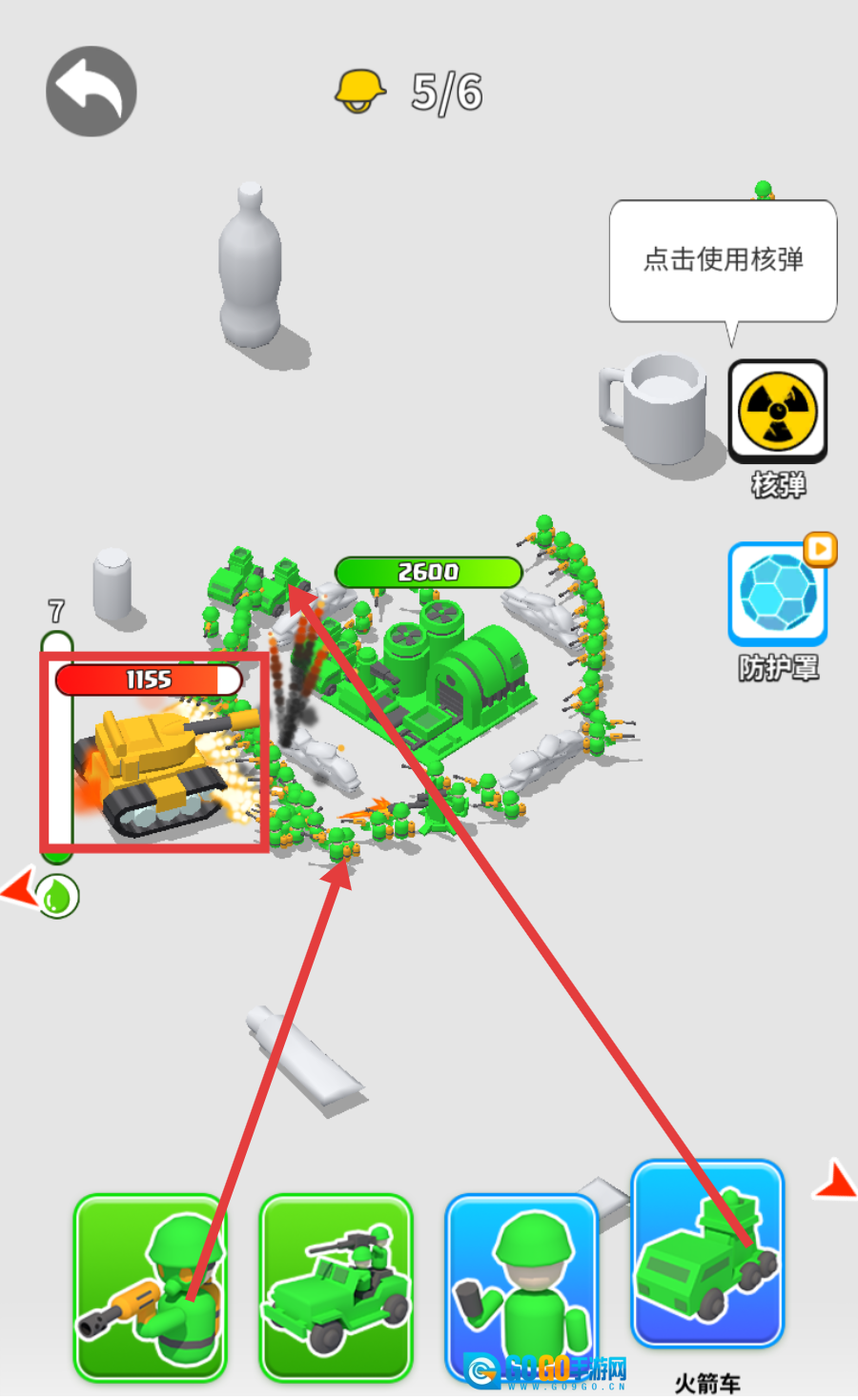 3、战斗中面对敌方【坦克-1155】时,利用【火箭车】攻击,同时留意【核弹】【防护罩】的使用时机。