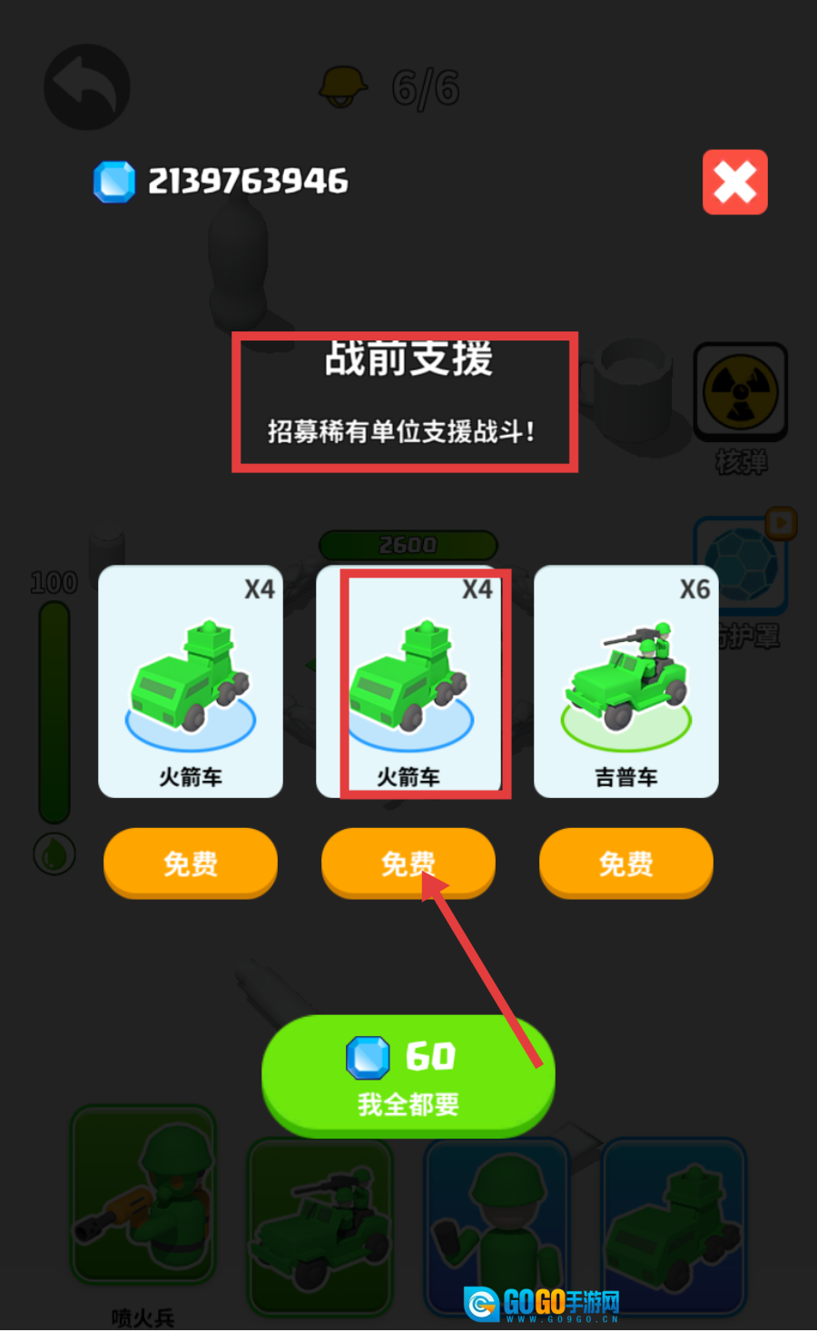 2、在【战前支援】界面,免费招募【火箭车】等稀有单位,为战斗增添强力战力,提升获胜概率。
