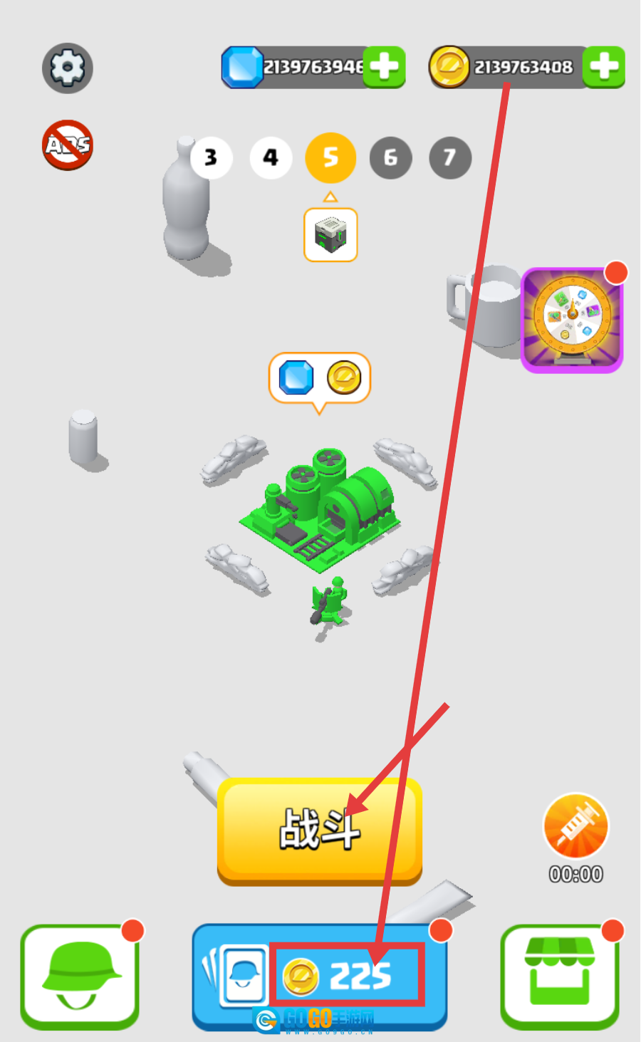 1、点击【战斗】按钮前,可消耗【金币-225】提升战力,合理利用资源为关卡战斗做好准备。