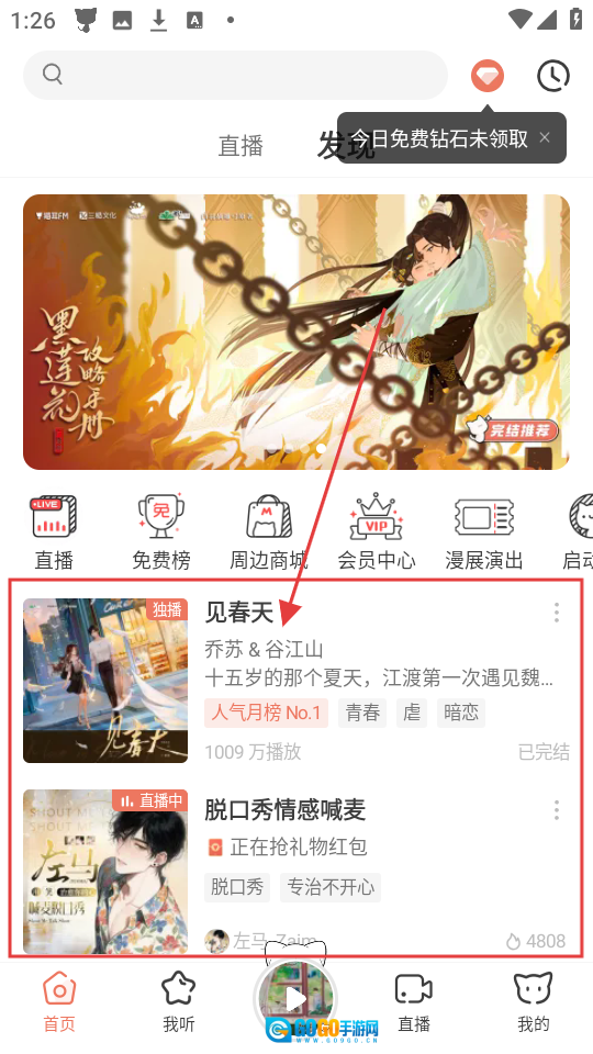 1、在发现页面找到《见春天》,点击进入就能开始收听精彩内容啦。