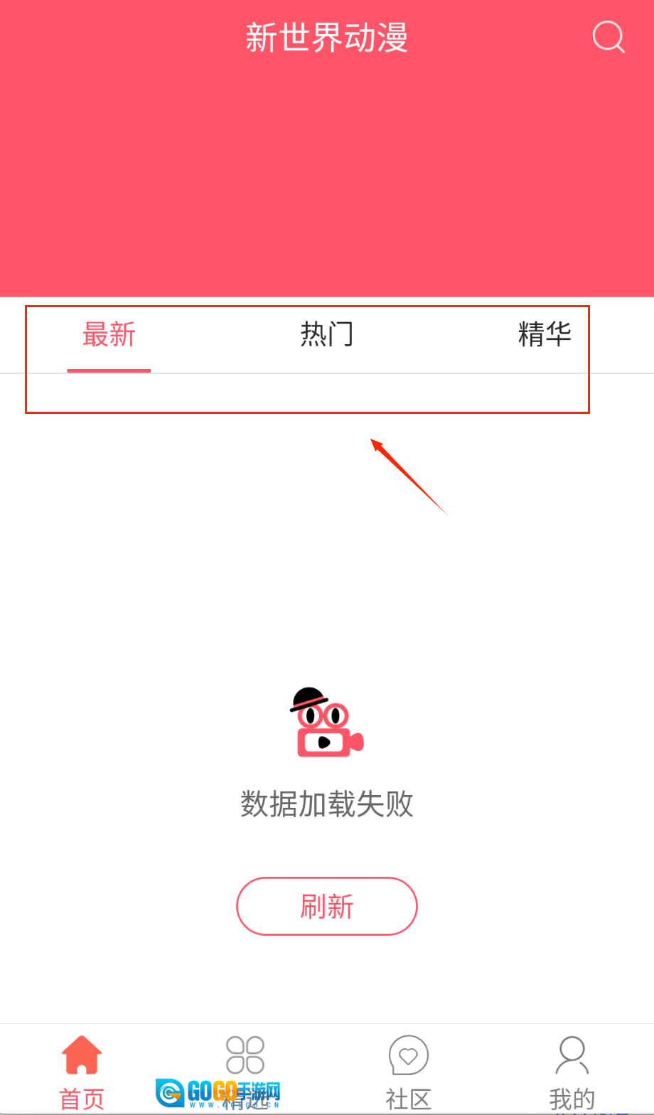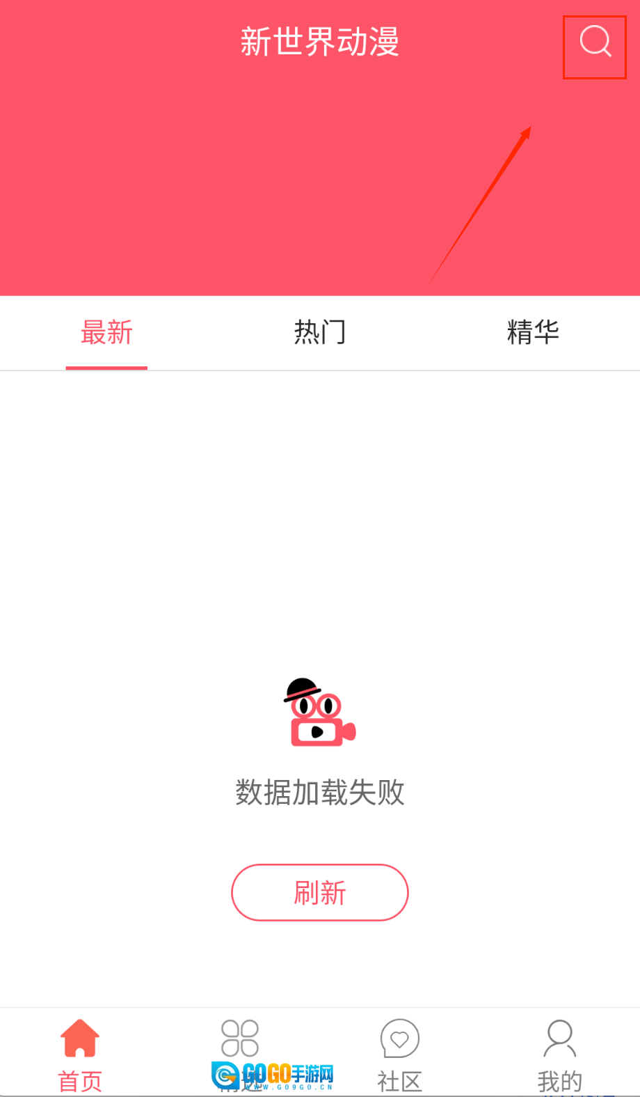 1、打开新世界动漫后首先会看到醒目的红色顶部横幅,中央显示"新世界动漫"名称,右上角有搜索图标。
