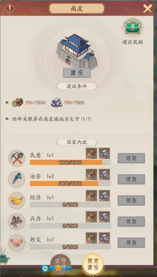 当木材和石材的数量充足,并且满足城池的建设要求后,就可以消耗相应数量的建材来进行城池建设。经过一段时间的等待,城池建设完成后就能领取颇为丰厚的奖励。