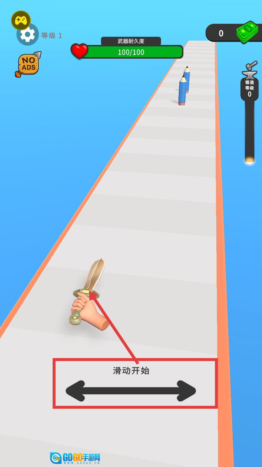 1、滑动开始游戏,初始【武器耐久度-100/100】,操控武器开始闯关,注意保持耐久。