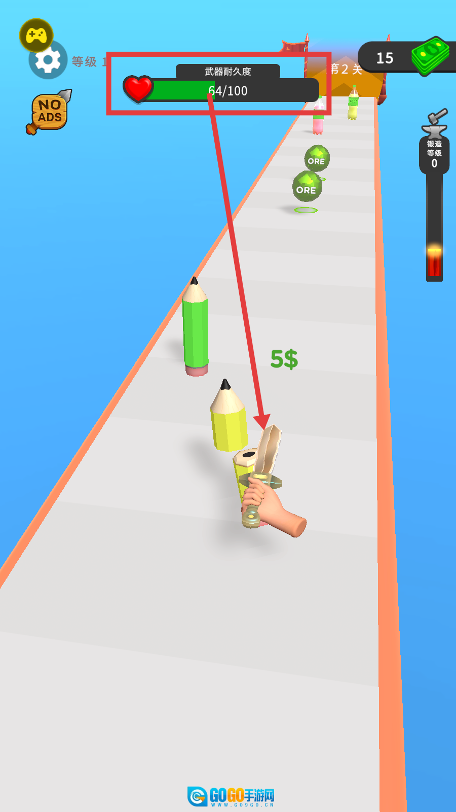 2、击碎【蓝色铅笔】,获取【5-美元】,金币累计到【5】,持续推进关卡,积累资源。