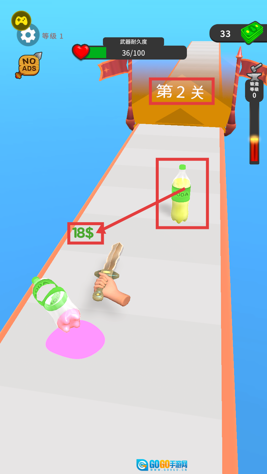 4、在【第2关】,击碎【苏打瓶】,获取【18-美元】,金币达【33】,推进关卡进程。