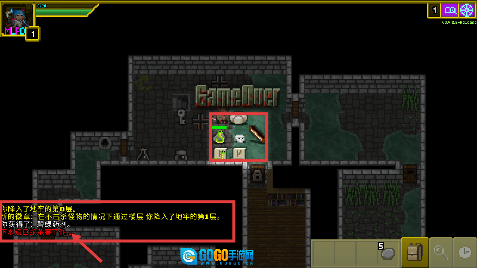 4、遭遇【下水道巨蛇】时需谨慎,其伤害高易致GameOver,探索时优先避开强力怪物,保障生存。