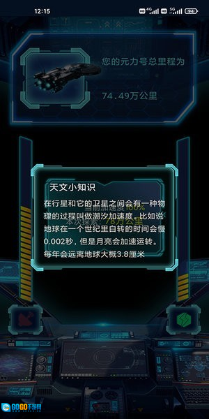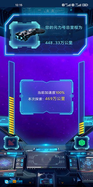 2、如何查看飞船信息:在飞船信息界面,查看元力号的总里程和当前加速度等信息。