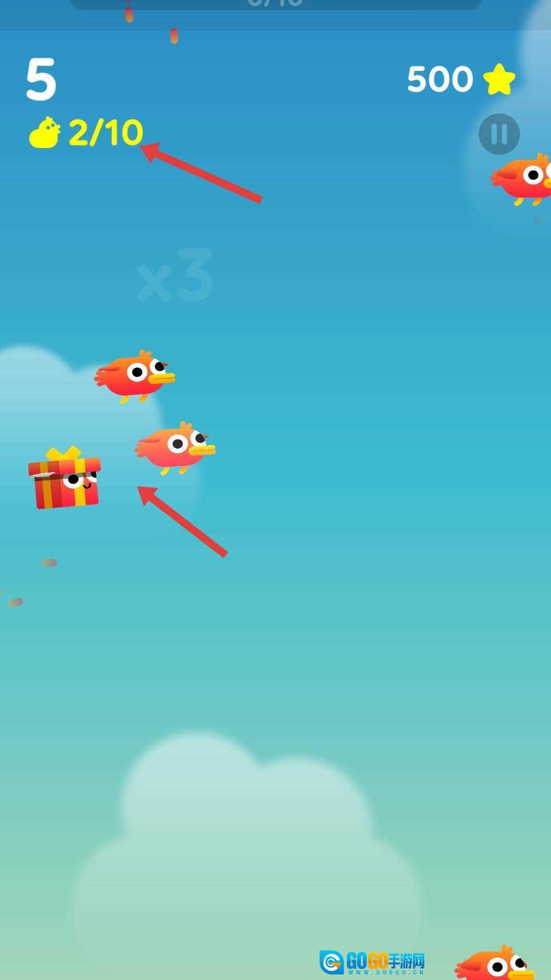 2、游戏过程需收集指定数量的小鸟,界面会显示收集进度,同时要避开或应对飞行中的小鸟等元素,推进收集进程。