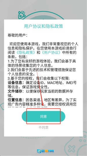 1、首先,认真阅读《用户协议和隐私政策》,确认无误后点击“同意”按钮即可进入游戏。