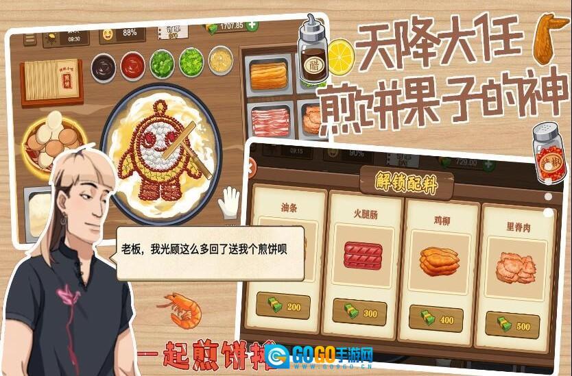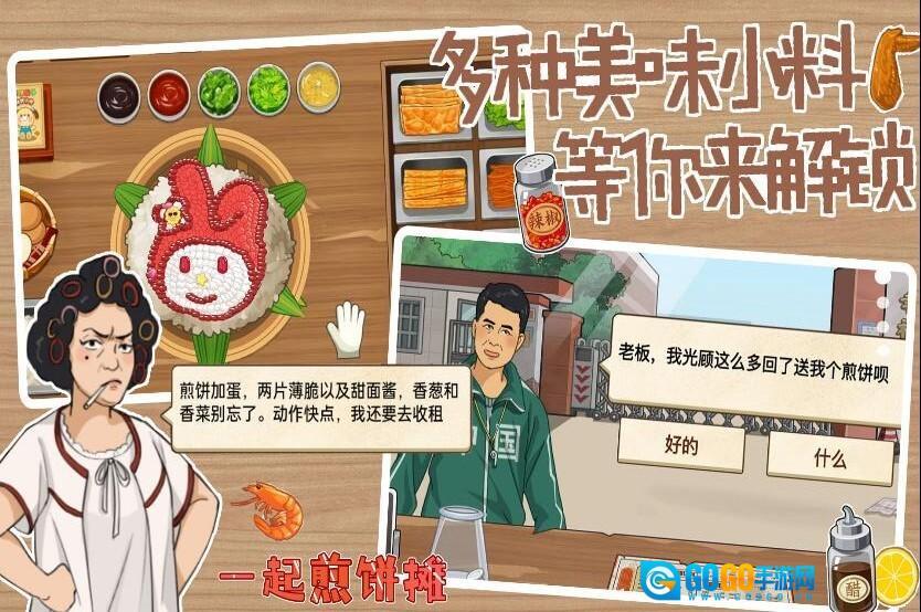 2、多样化的菜单:游戏中提供了丰富多样的煎饼菜单,包括经典的葱油饼、肉松饼、火腿饼等等。玩家可以根据顾客的口味需求来选择不同的煎饼搭配,提供个性化的服务。
