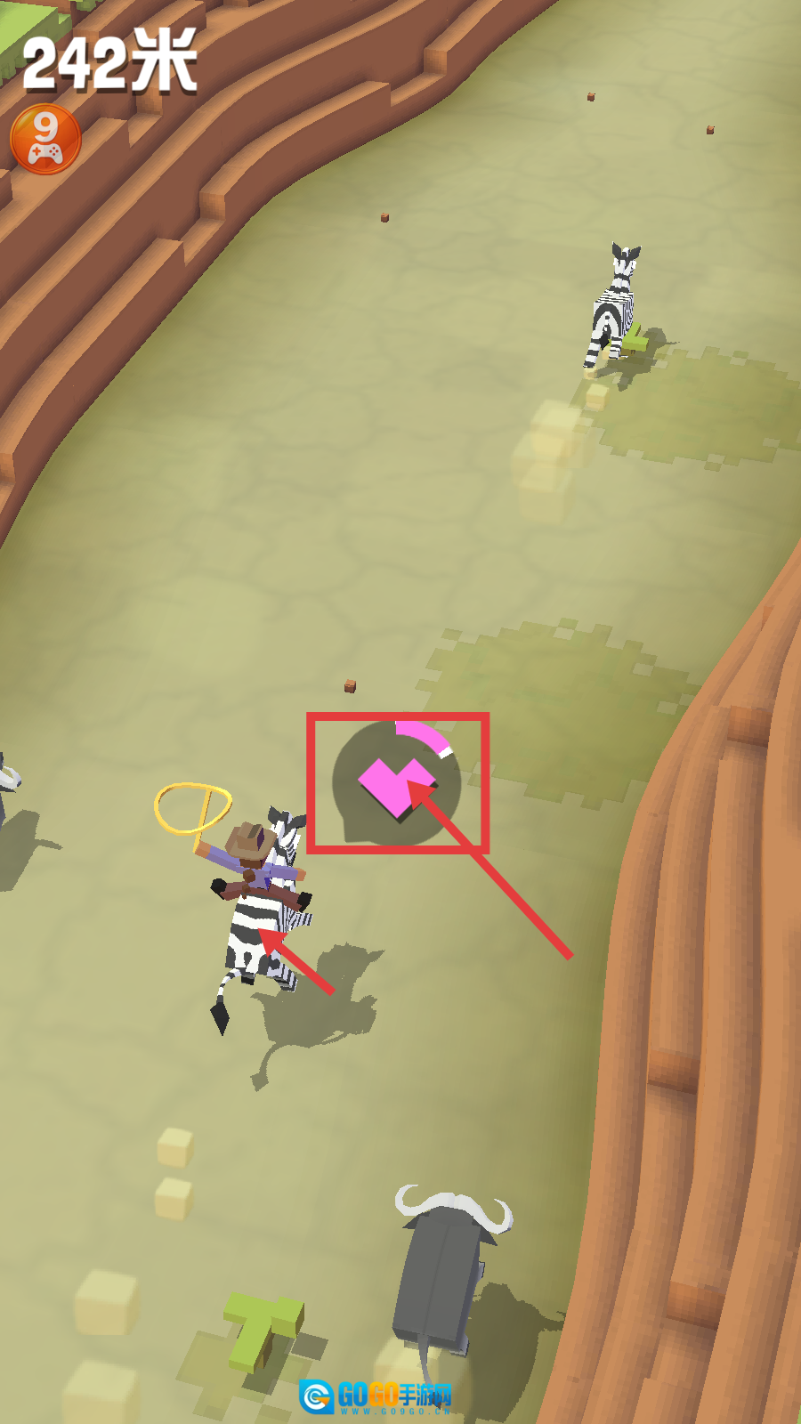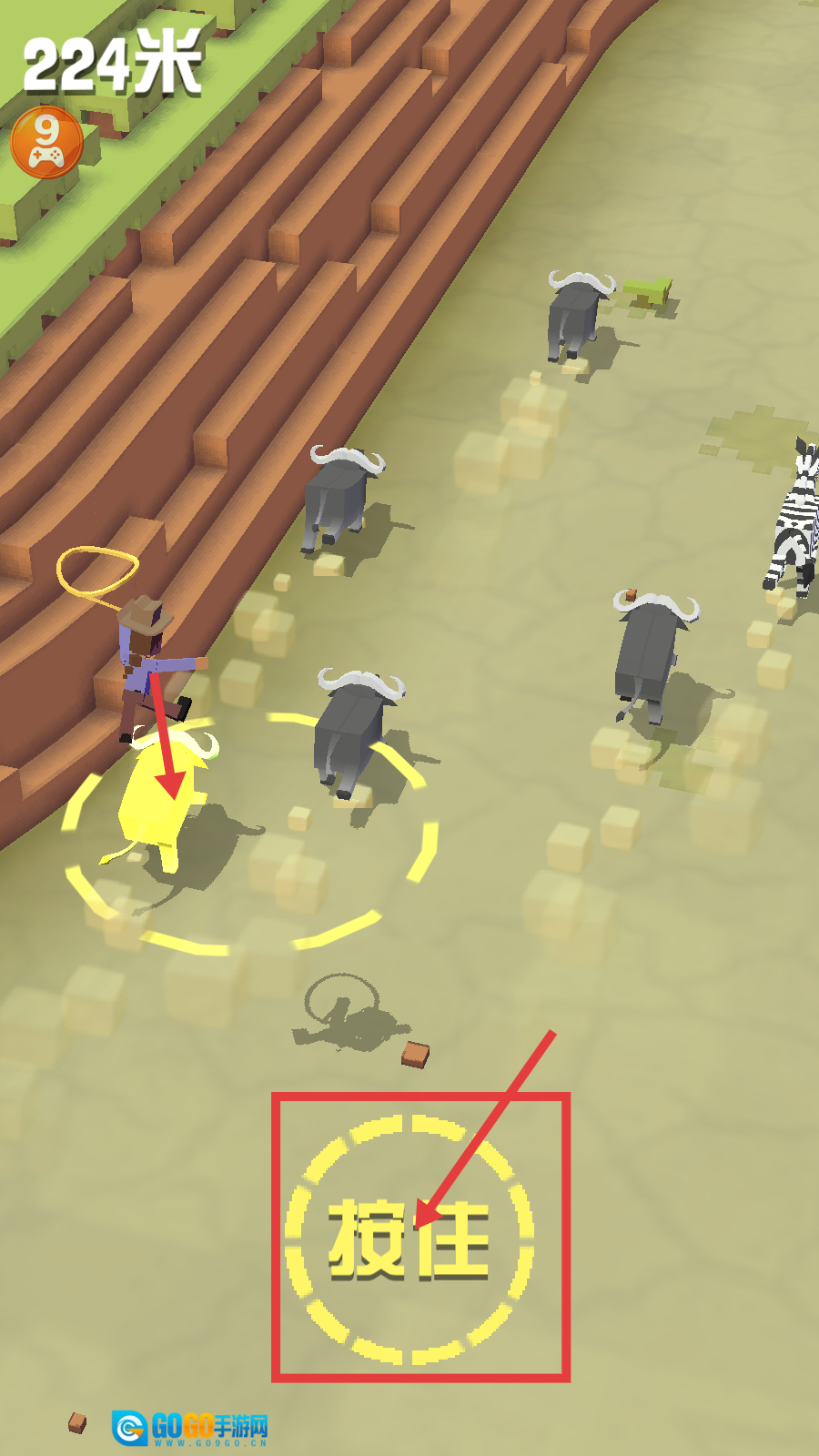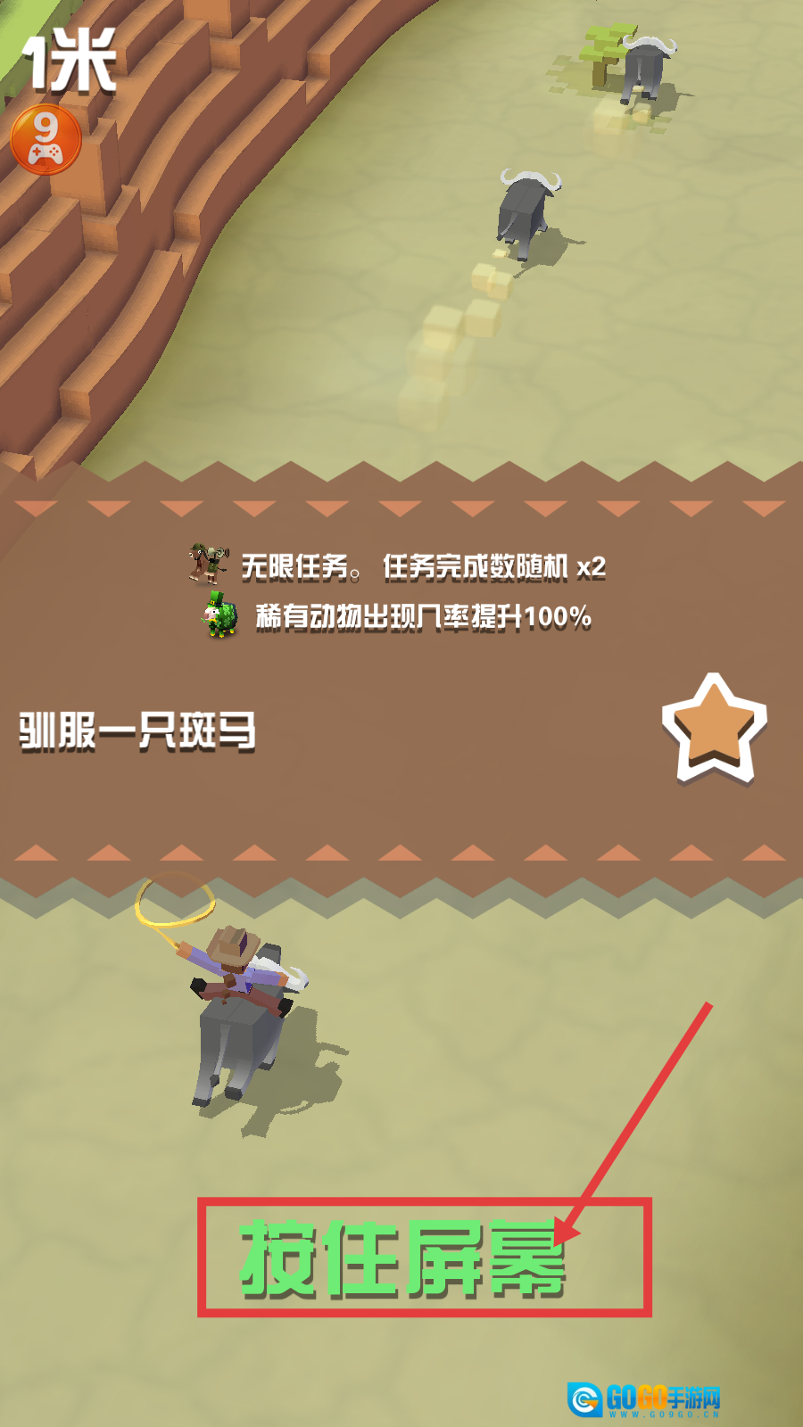 1、接取【驯服一只斑马】任务后,利用【任务完成数随机x2】和【稀有动物出现几率提升100%】buff,按提示【按住屏幕】开启驯服操作。