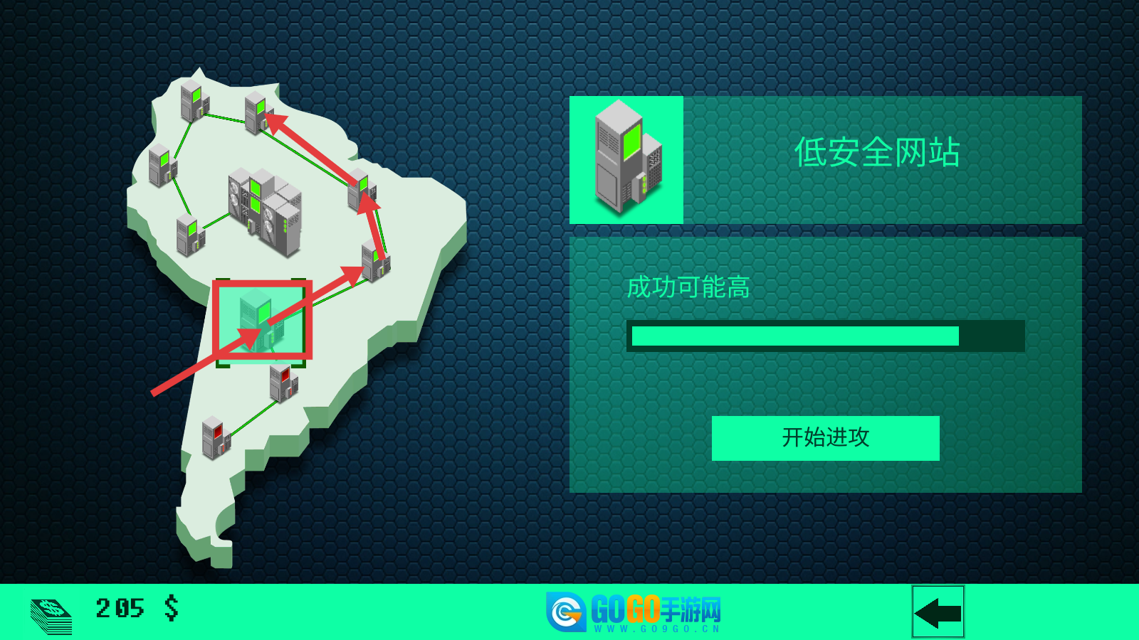4、瞄准【低安全网站】,其【成功可能高】,点击【开始进攻】,持续积累资源与能力,拓展侵入版图。