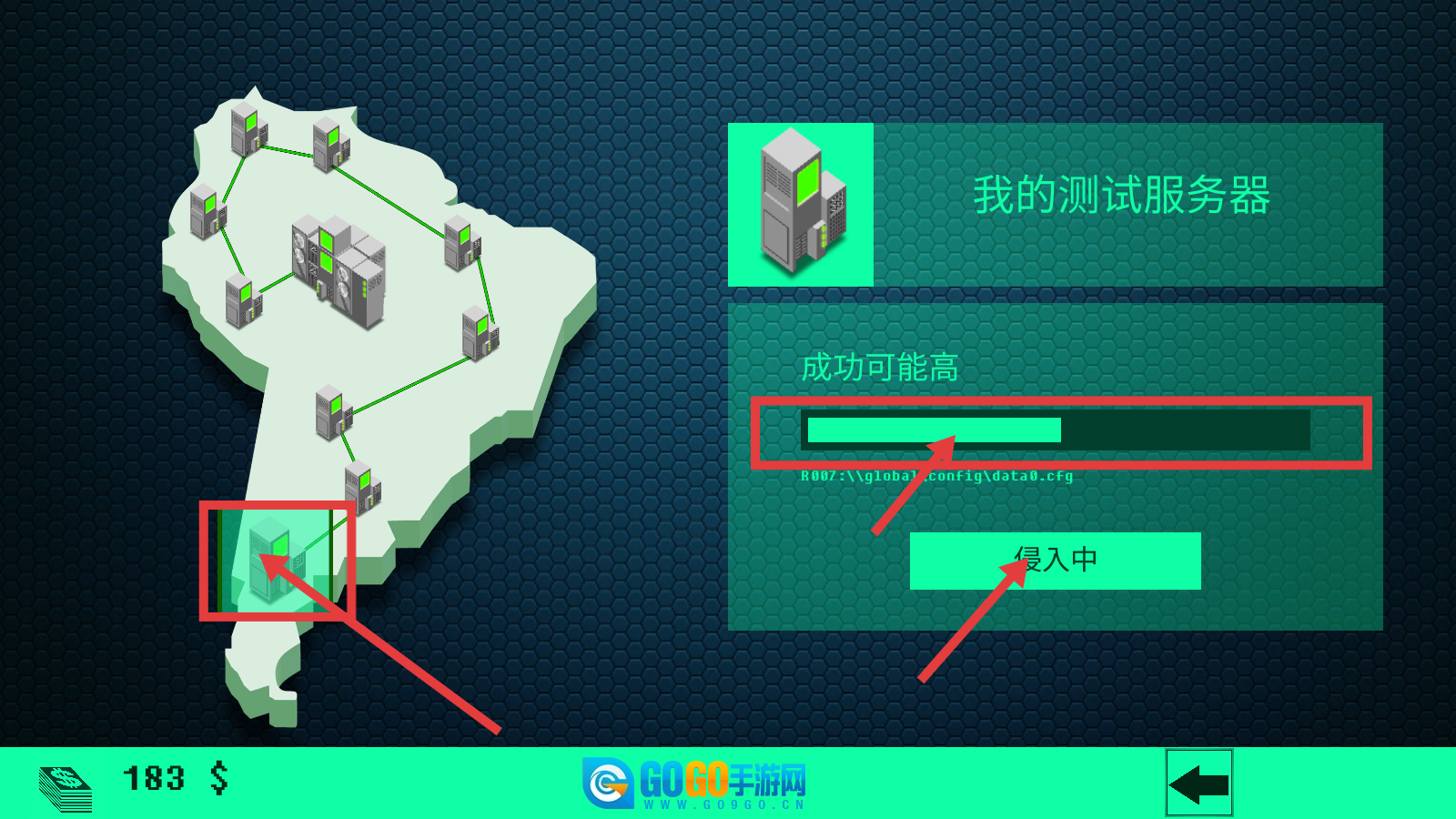 2、选择【我的测试服务器】,观察【成功可能高】进度条,点击【侵入中】开始侵入,获取资源与经验。