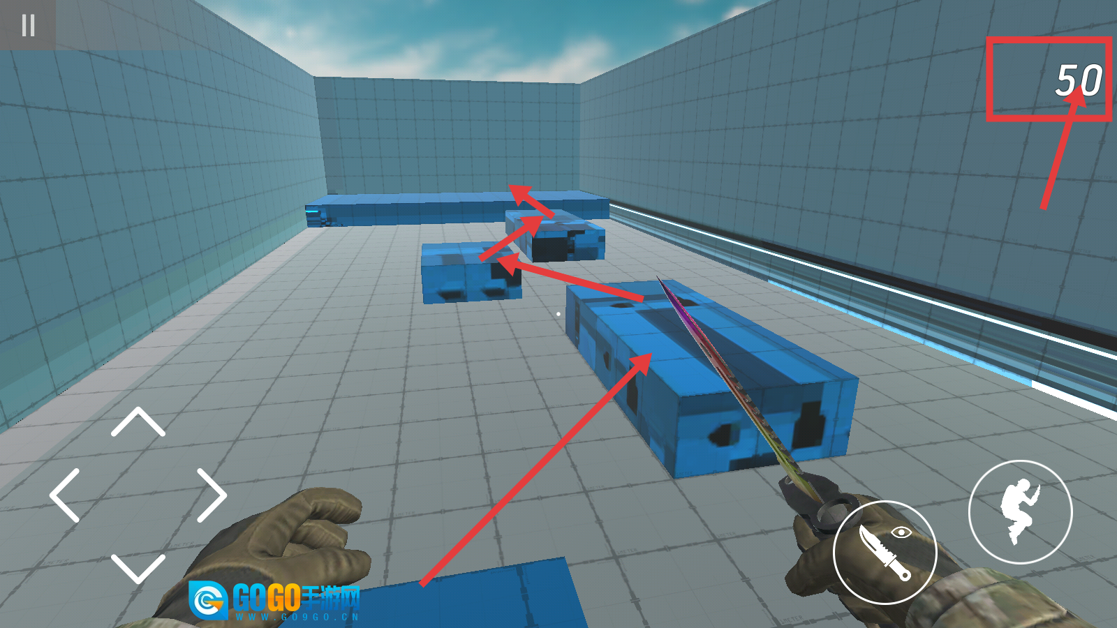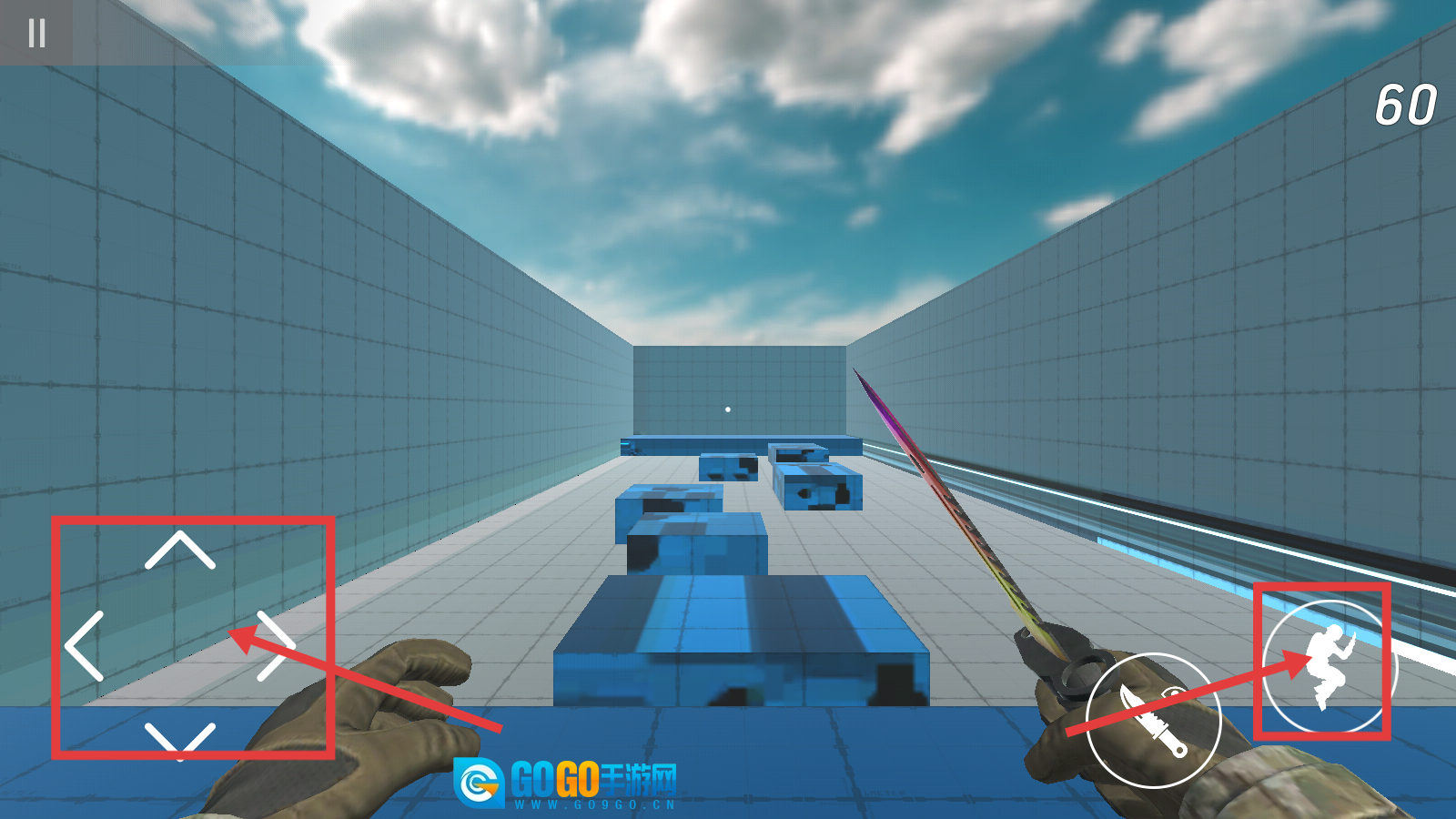 2、利用左侧方向键移动,右侧跳跃键在蓝色方块关卡中跳跃,掌握移动与跳跃的节奏。