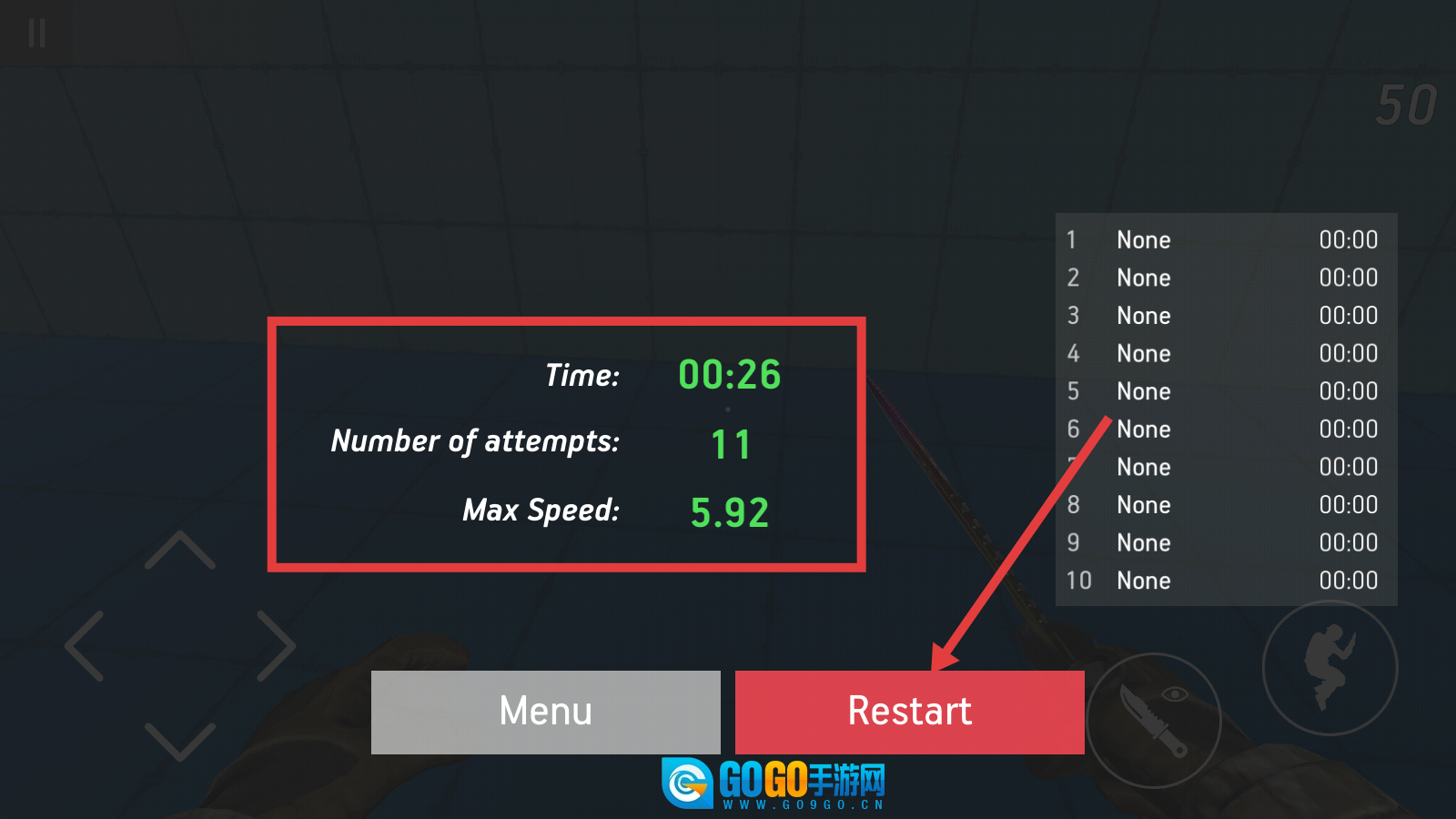 4、关卡结束后查看【Time-00:26】【Number-of-attempts-11】等数据,点击【Restart】重新挑战以提升成绩。