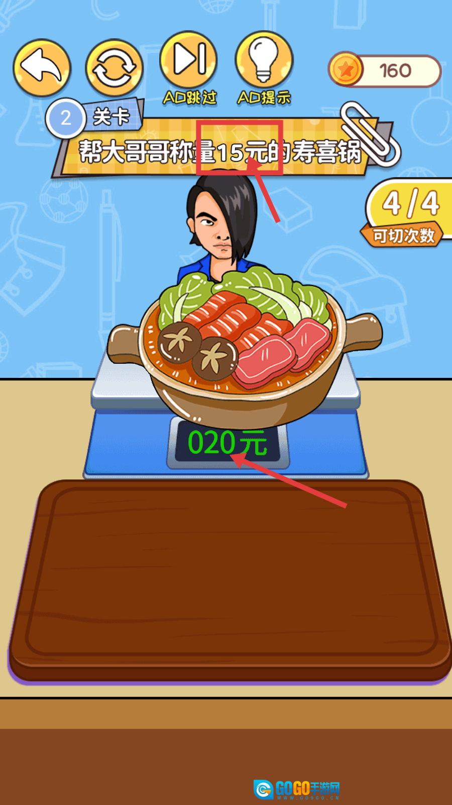 2、进入【关卡2】,任务是【帮大哥哥称量15元的寿喜锅】,观察秤上【020元】的显示,准备调整寿喜锅的量以达到目标金额。